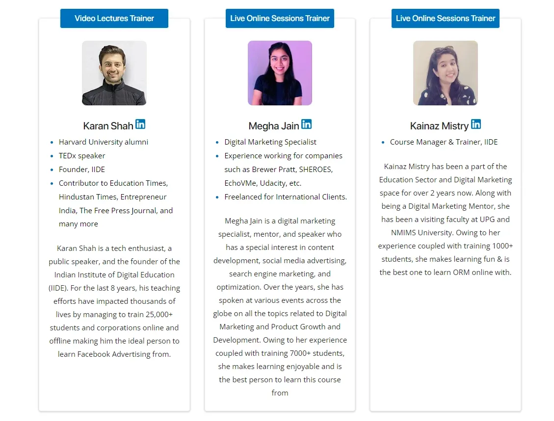 IIDE has a team of wonderful trainers, who are industry experts and have hands-on experience in the subject they teach. This helps the students to learn from the top business leaders and get some insights into the corporate world as well. Below mentioned is the trainer responsible for teaching IIDE’s Online Social Media Marketing course:
