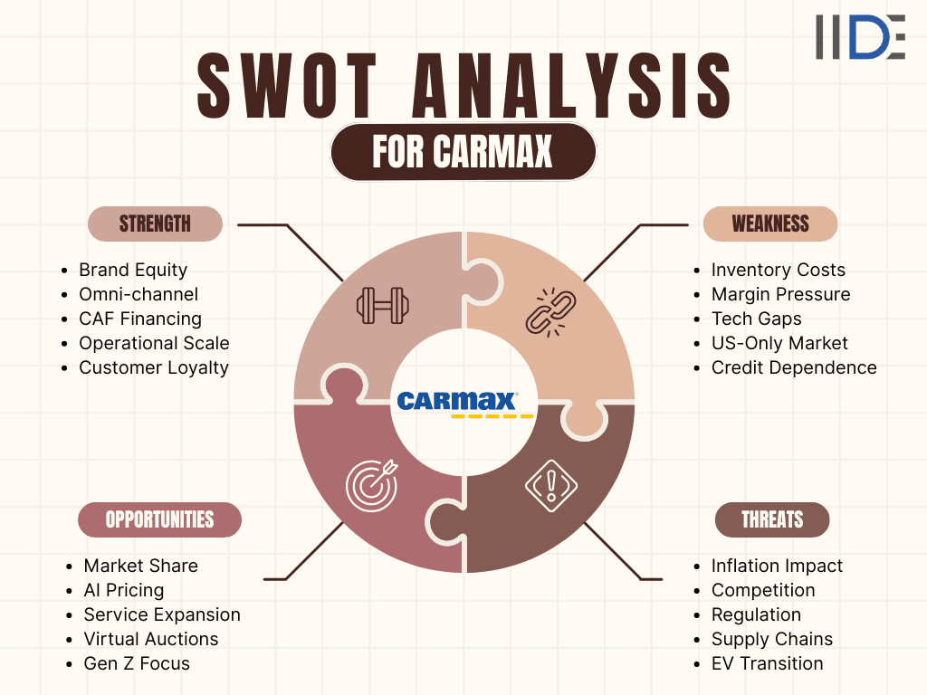 CarMax has become the largest used-car retailer in the U.S. with over 250 stores and a trusted brand. Its pioneering no-haggle pricing and seamless omni-channel strategy position it uniquely in a fragmented market. But how does CarMax fare amidst rising inflation, digital transformation, and EV trends? This SWOT analysis offers an eye-opener for business students and auto entrepreneurs eager to understand the market dynamics in 2025.