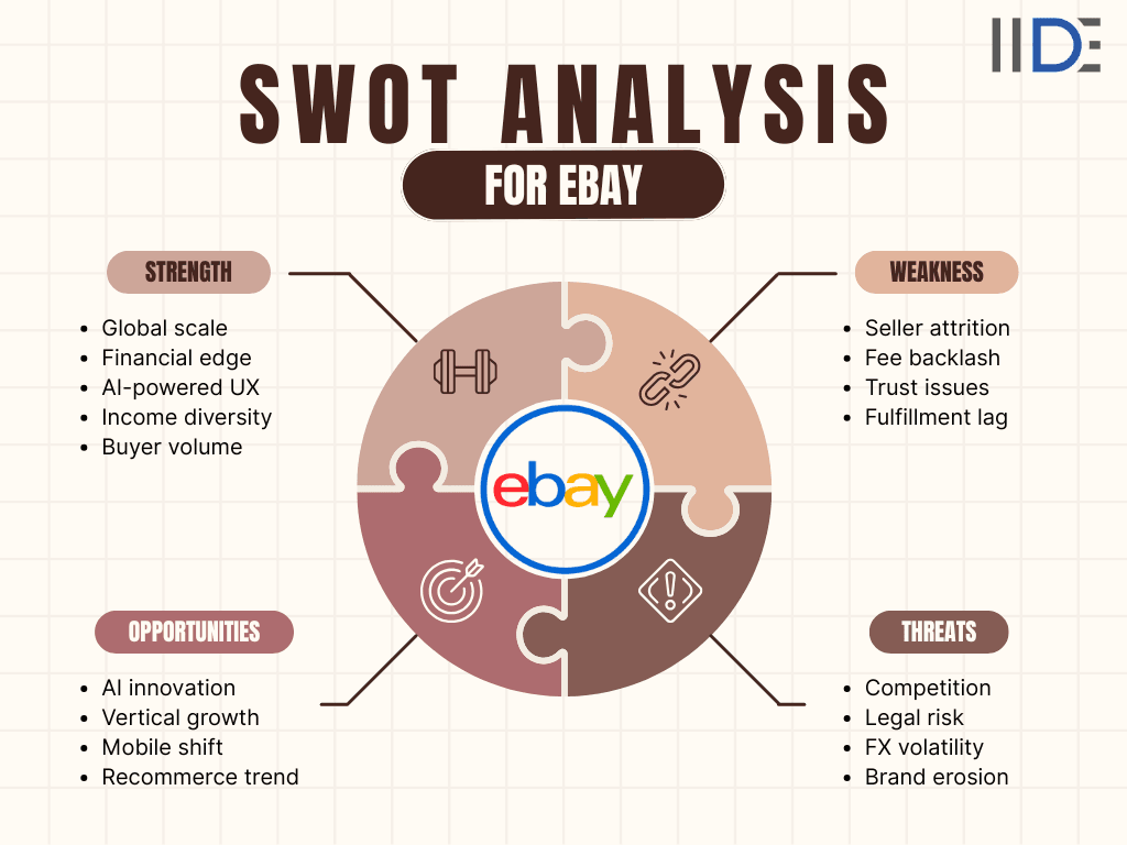 Founded in 1995, eBay is a global online marketplace with 134 million active users across 190+ countries. Despite facing fierce competition from Amazon and Etsy, eBay maintains relevance through AI integration, luxury reselling, and a strong trust model. But can it navigate backlash from recent policy changes and rising platform fees? Let’s explore eBay’s 2025 SWOT analysis to understand its future potential, a must-read for entrepreneurs and marketing students.